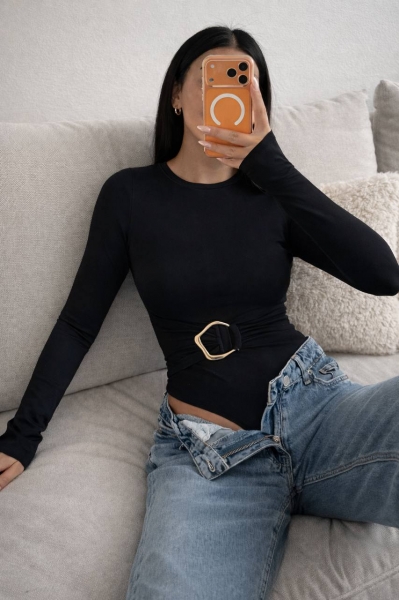 Стильные боди в шоколадном и черном цветах с драпировкой на талии и золотой пряжкой. Идеальны для создания элегантного и женственного образа
