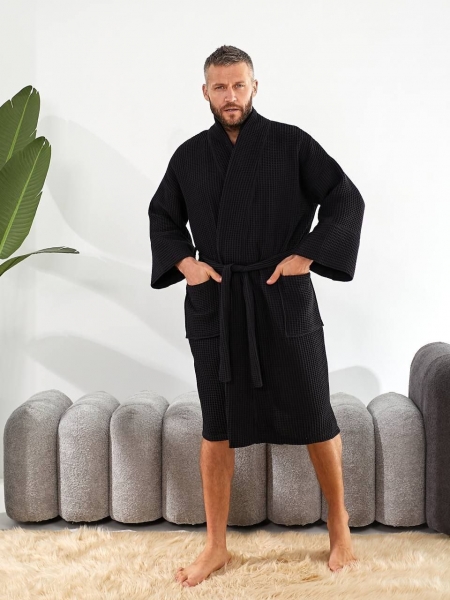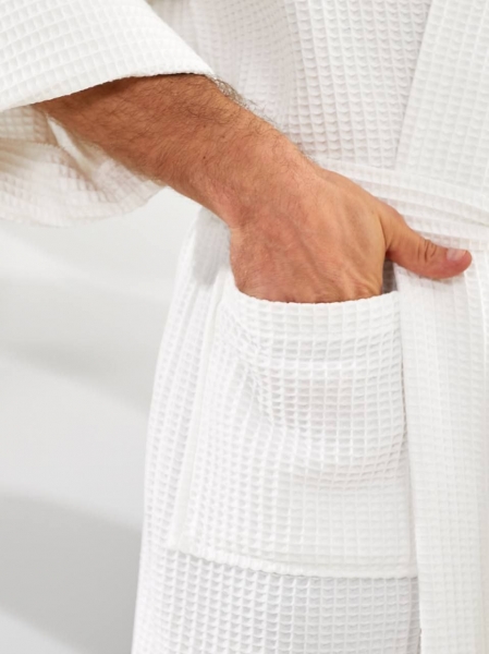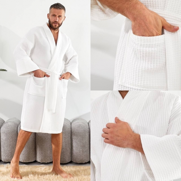 Халат дополнен поясом, большими карманами и широкими рукавами. Ткань быстро впитывает влагу и быстро высыхает.