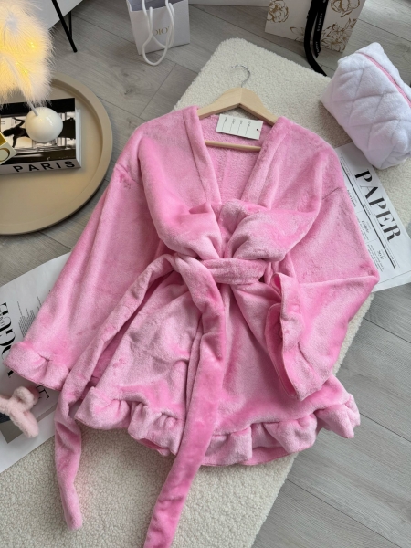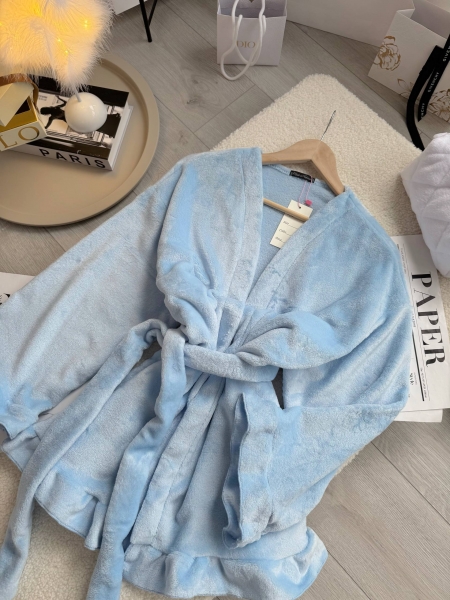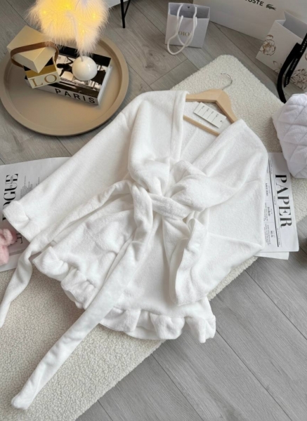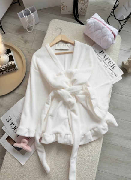 Невесомые воздушные рюши идут по низу халата и на манжетах рукавов. Эти детали придают образу нежности и легкости.