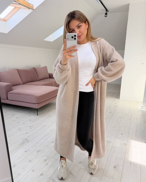 Кардиган удлиненный, рукав широкий, плечо спущено, пояс идет отдельно, не пришит, ткань тянется