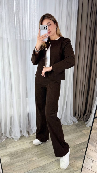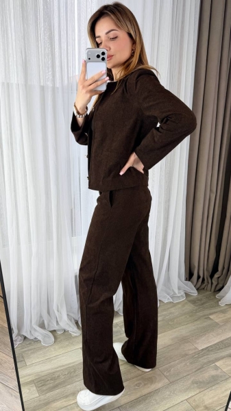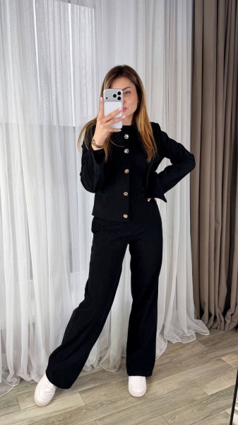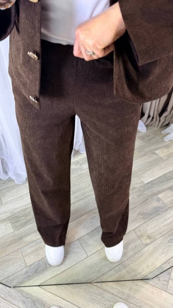 Костюм жакет полуприталенный, карманы декоративные, застегивается на пуговицы. Брюки прямого кроя, талия на резинке, с двумя карманами. Ткань плотная, тянется хорошо