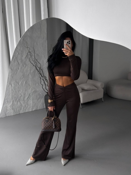 Невероятно стильный костюм с драпировкой, очень круто подчеркивающий фигуру. Будь стильной всегда.