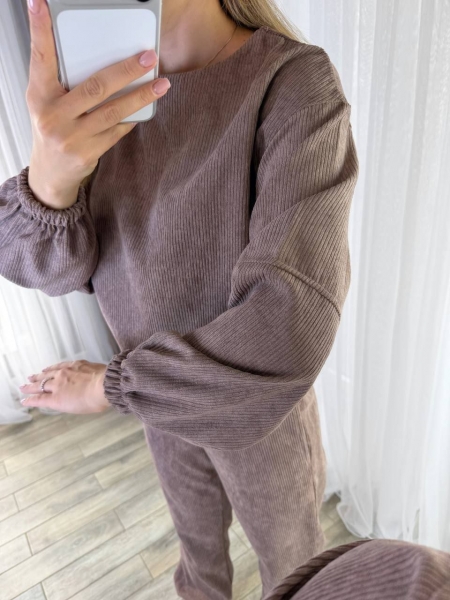 Костюм кофты свободного кроя, низ на резинке с фиксаторами, рукав манжет на резинке. Брюки талия на резинке с фиксатором, низ брюк на резинке, с двумя карманами.