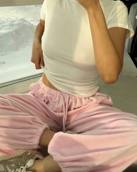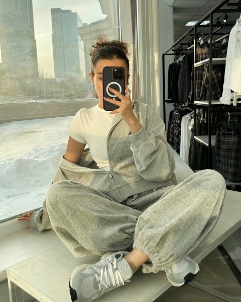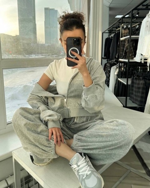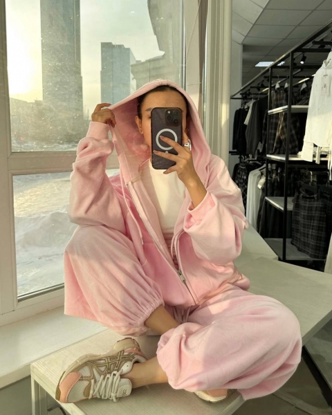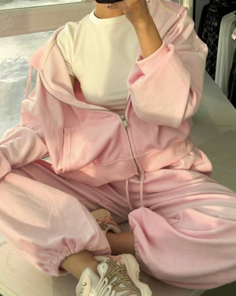 Спортивный оверсайз костюм с тощей на змейке, топа и объемных штанов. Приятная мягкая ткань хорошо тянется. Манжеты рукавов и пояс кофты выполнены из Рибаны. Идет со шнурками, как на фото.