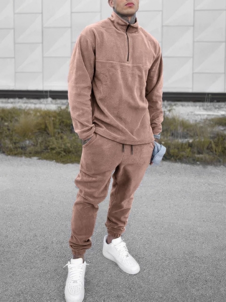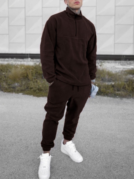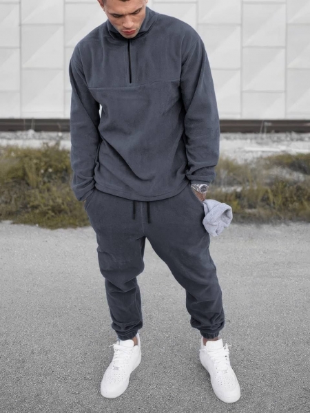 Верх костюма имеет высокий воротник на молнии, что придает практичности и обеспечивает дополнительную защиту от ветра. Брюки выполнены в свободном стиле с эластичным поясом со шнурком.