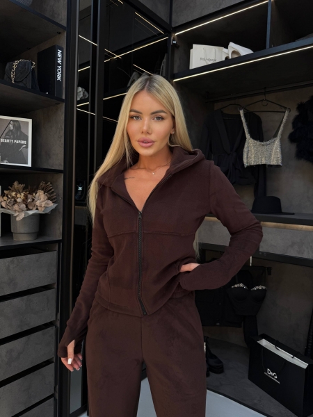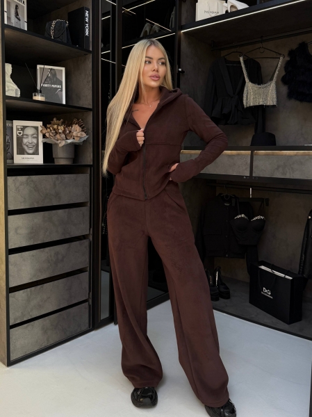 Флисовый костюм-двойка с идеальным пошивом. Его очень удобно одевать под верных одежду, так как кофта не является объемной. Также есть капюшон. На рукавах прорези на пальчик.