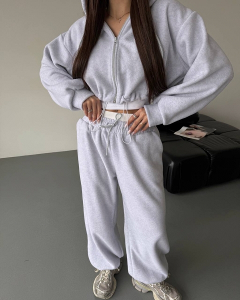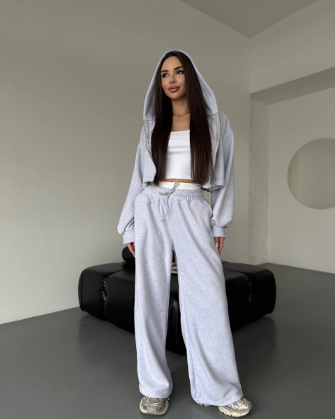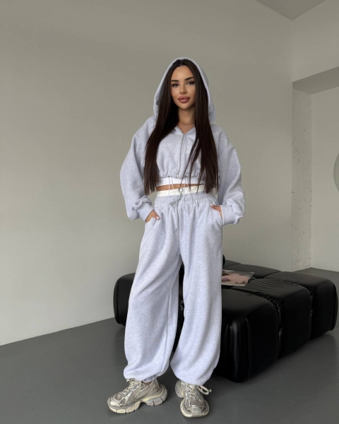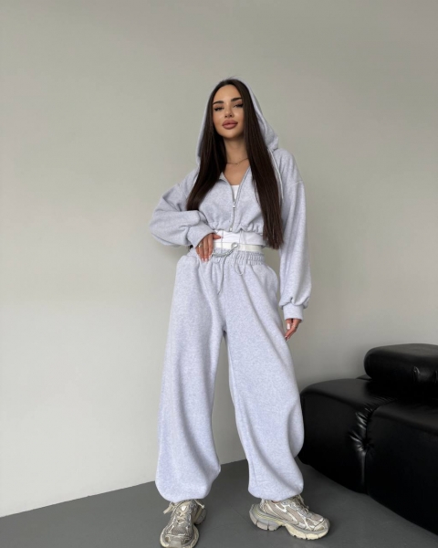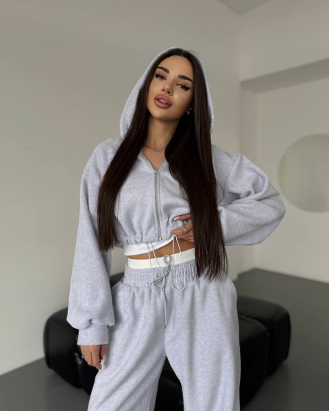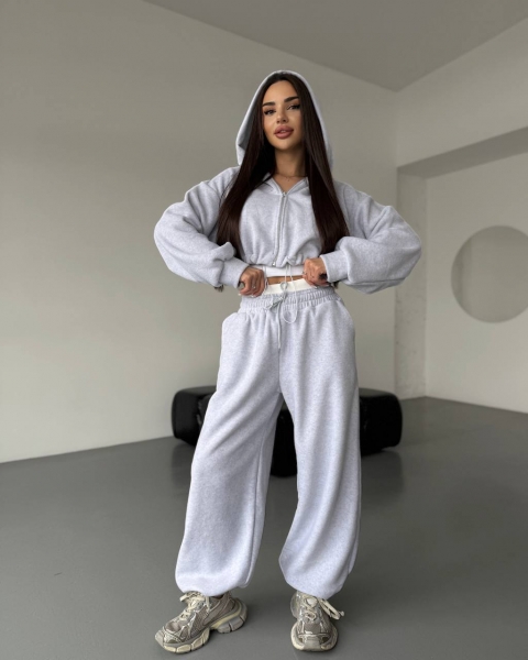 Спортивный прогулочный костюм – тройка в стиле оверсайз, из укороченной кофты, топа и объемными брюками. Теплый по сезону из мягкой плотной ткани. Топ тянется и садится по фигуре. Кофта и брюки имеют снизу фиксаторы для удобства. Брюки идут с резинкой, как на фото, и шнурками.
