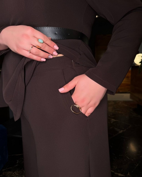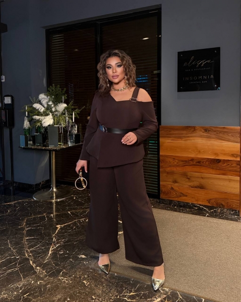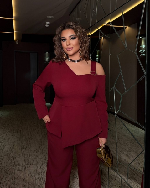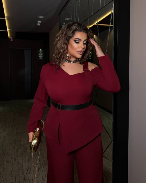 Нарядный костюм-двойка: блуза интересного кроя: одно обнаженное плечо с украшением, V-образный вырез, низ клеш с разрезом, по спинке золотая молния, черный пояс с украшением идет в комплекте.