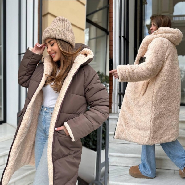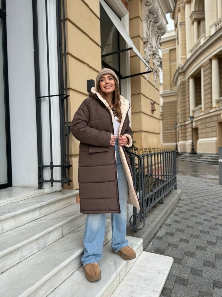 Супер теплая, двусторонняя курточка/шубка. Длина 105 см
