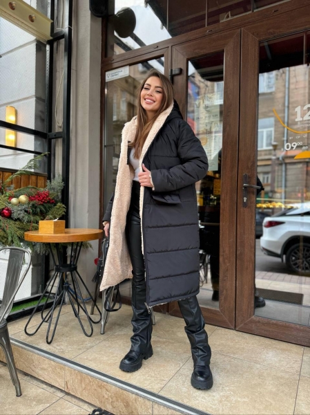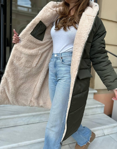 Супер теплая, двусторонняя курточка/шубка. Длина 105 см