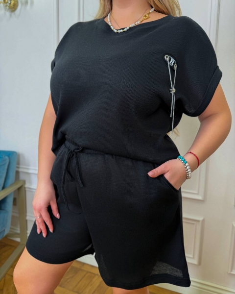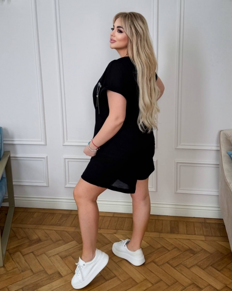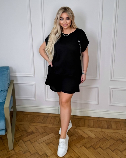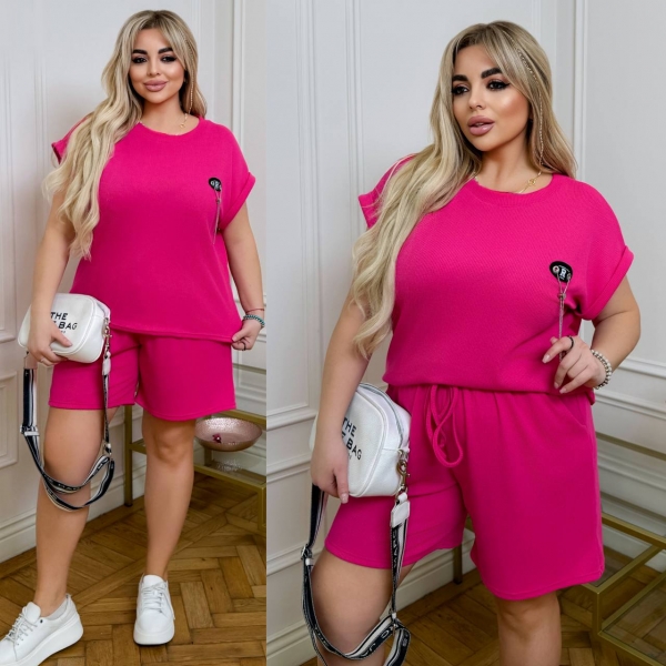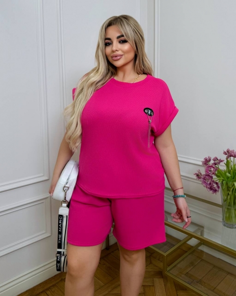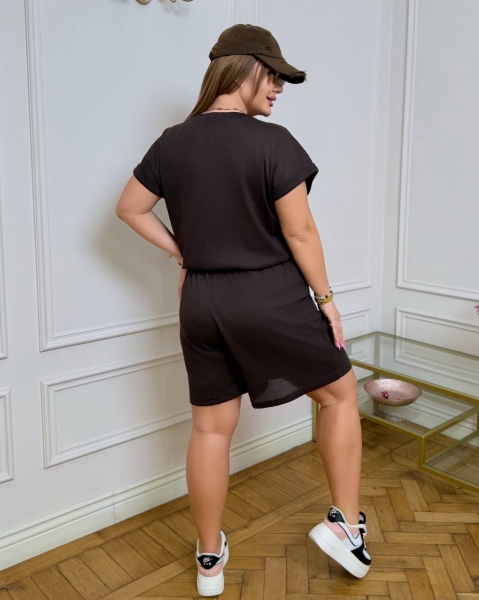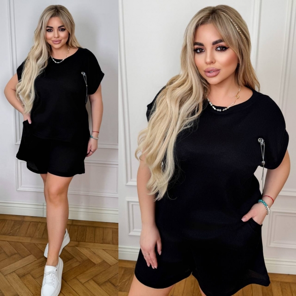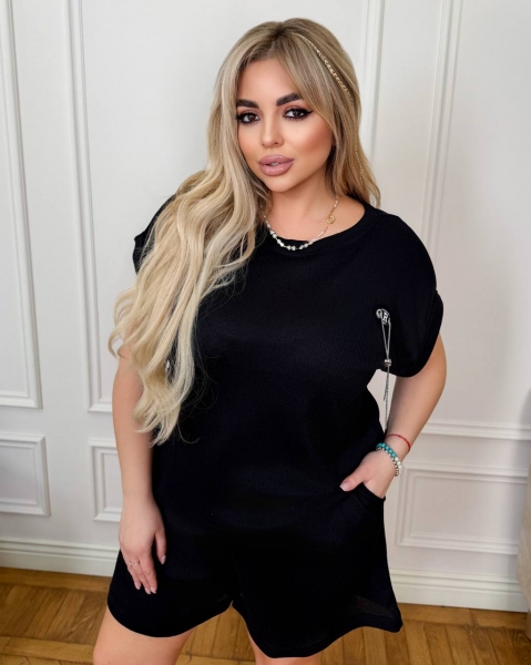 ( костюм из трикотажа стрейч «вафелька»: футболка с манжетами на рукавах и Акс + шорты с высокой посадкой на резинке, с кошками в боковых швах и шнурком на поясе).