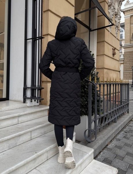 Пальто на замочке. Есть капюшон, пояс. На рукаве есть нашивка.