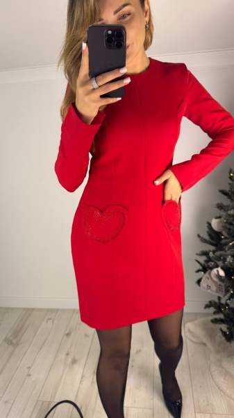 Плаття приталеного крою, з декоративними гаманцями, застібається позаду на блискавку, на рукавах розріз