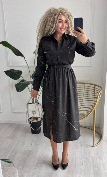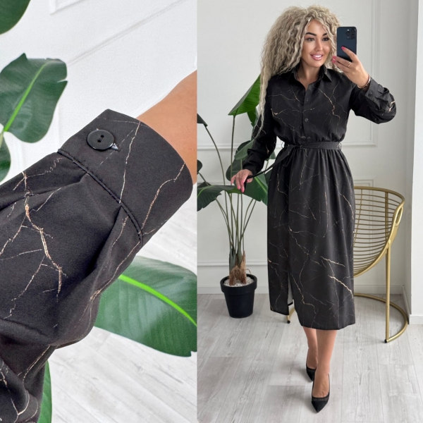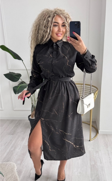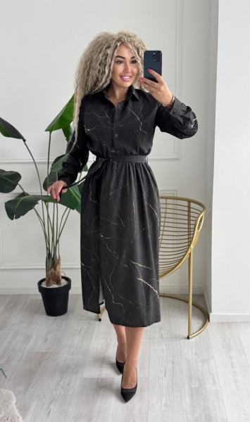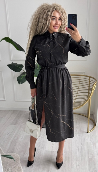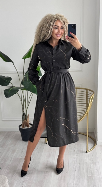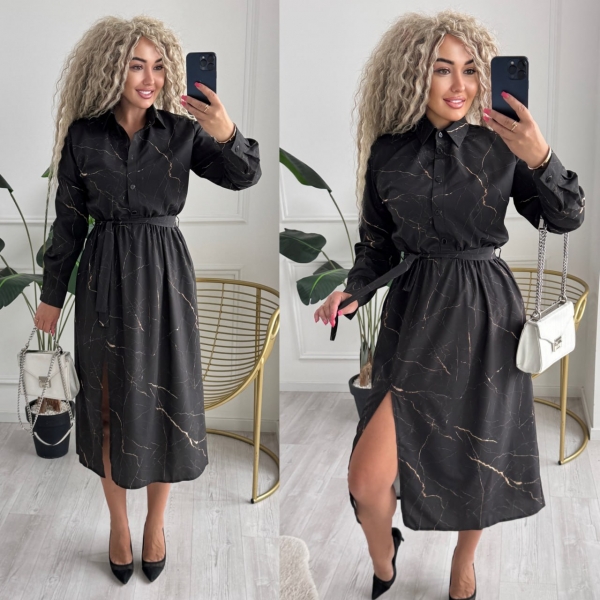 Описание: Платье-рубашка меди длина с боковым разрезом. Модель с воротником и длинными рукавами, застегивается на пуговицы, на талии резинка, в боковых швах карманы.