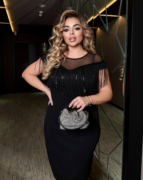 Платье декорировано элегантной бахромой с пайеткой