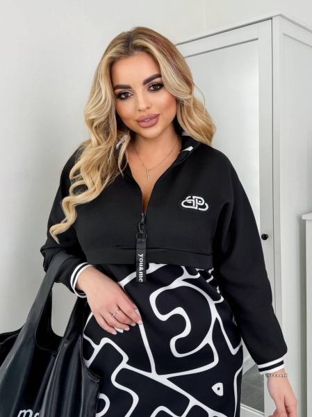 Платье спорт шик, удачная комбинация однотона с принтом, делает изделие изящным и оригинальным, привлекает взгляды. Рукава и низ украшены черно-белыми лампасами, горловина стойка на молнии с карабином (внутренняя часть горловины украшена принтом с буквами), на груди накат с камешками, по бокам два кармана. Рукав-реглан свободного кроя. Платье интересного кроя: планочка спереди и сзади, подчеркивает ваши прелести и скрывает лишние объемы на талии.