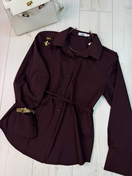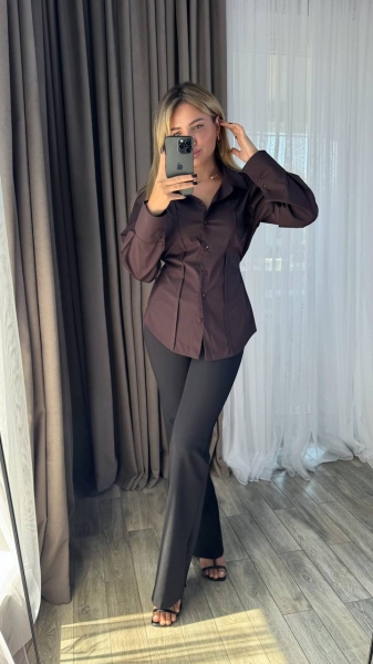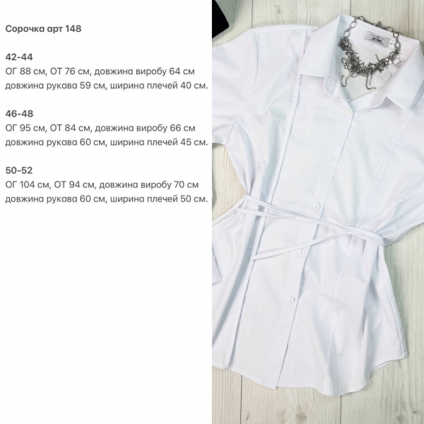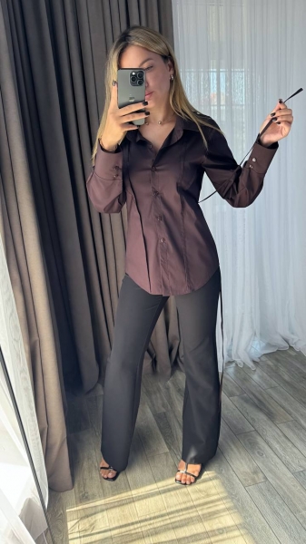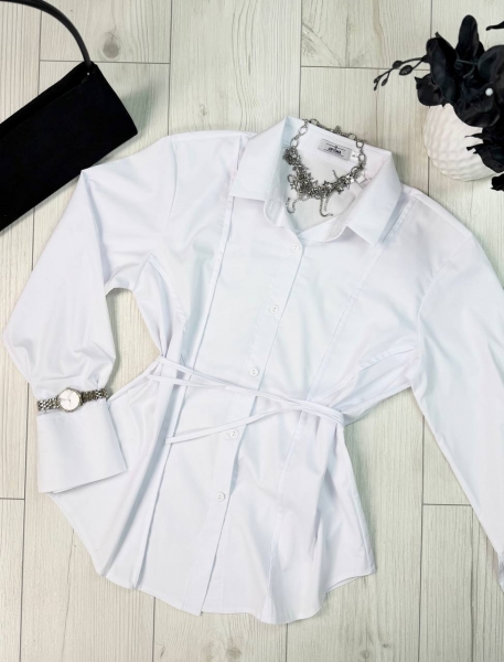 Рубашка приталенная, сзади есть веревки, которые можно завязать и подчеркнуть линию талии, рукав на широком манжете, застегивается на две пуговицы, рукав свободный