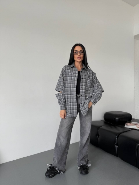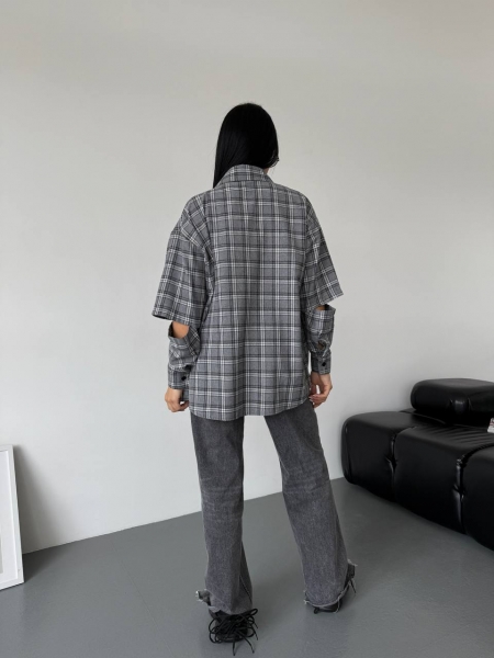Удобная рубашка в клетку с разрезами на рукавах. Застёгивается на пуговицы. Сшита из качественной приятной ткани. Идет в стиле оверсайз, свободного фасона.