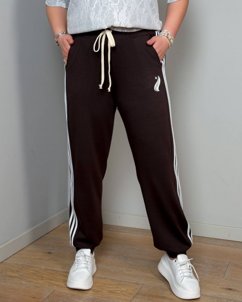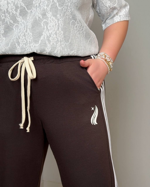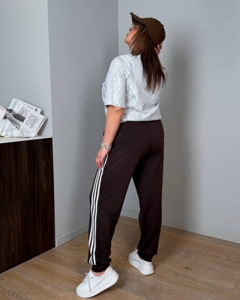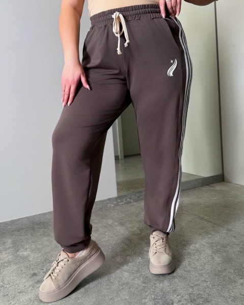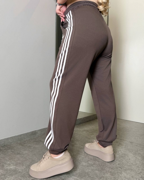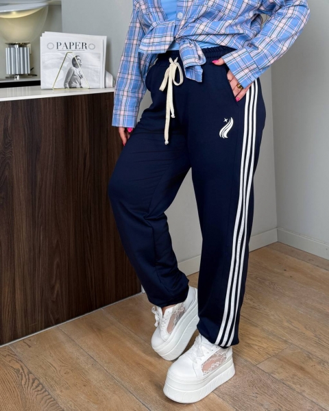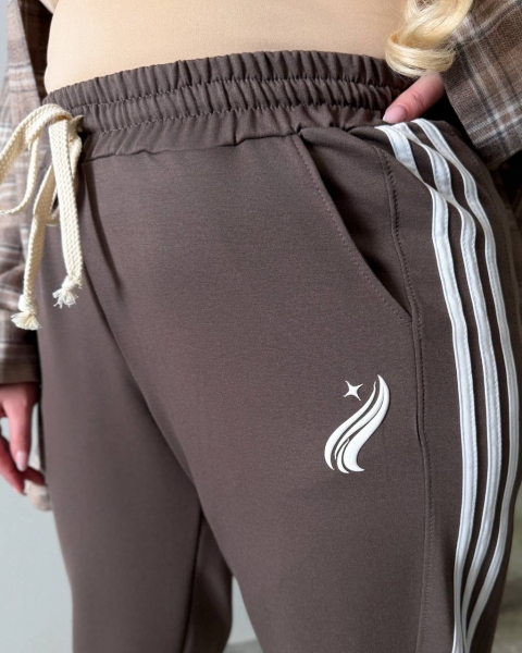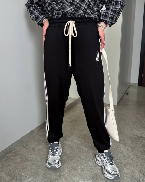 Женские брюки спортивного типа прямого свободного кроя, средней посадки, пояс на резинке с выведенным шнурком для регулировки объема. С карманами, по боковым швам – двойные контрастные лампасы.