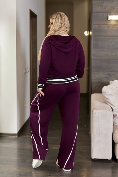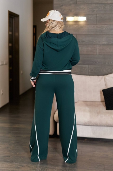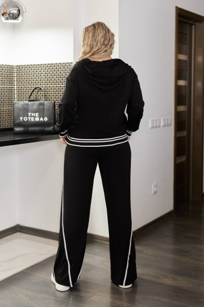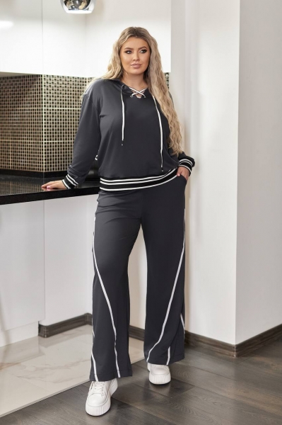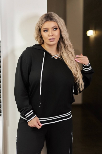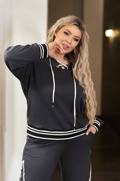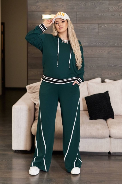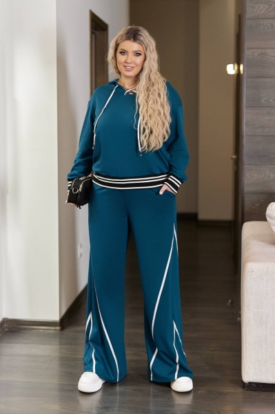 Худые свободного кроя с капюшоном, на груди имеет шнуровку, низ худые и манжеты украшены рыбаком, брюки высокой посадки с боковыми карманами, свободного кроя.