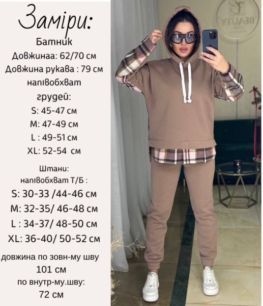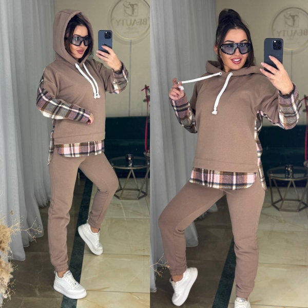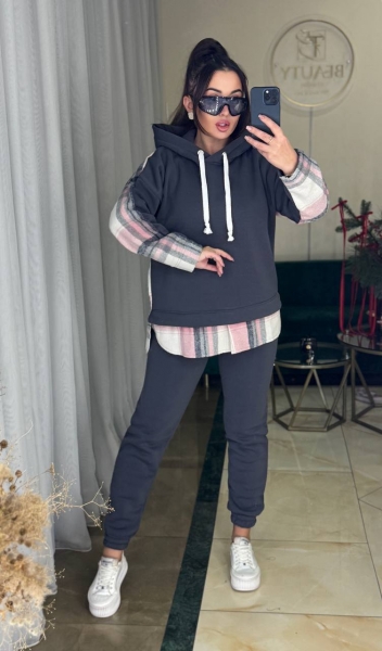 Описание: Женский стильный и теплый костюм, толстовка с капюшоном и имитацией рубашки. Брюки на широкой удобной резинке.