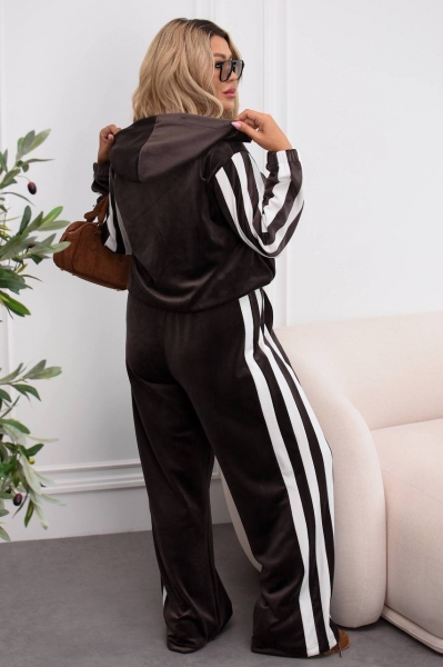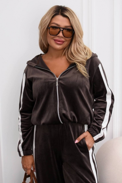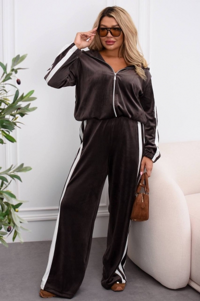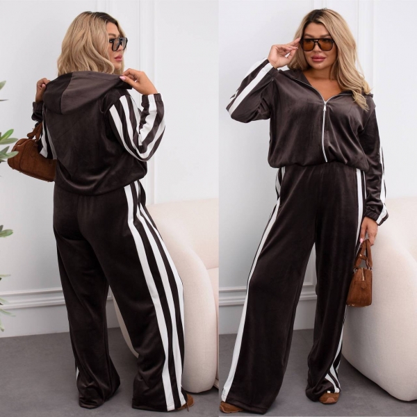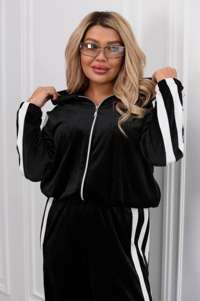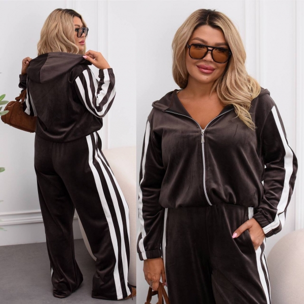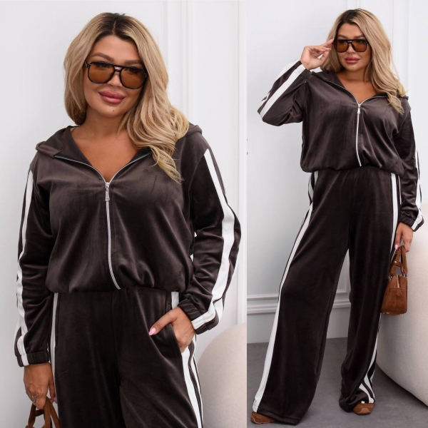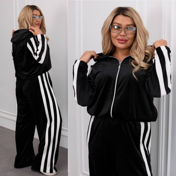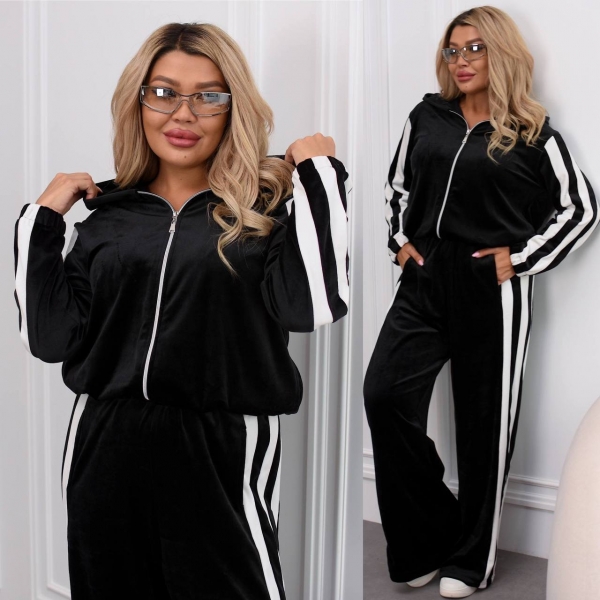 Модный и удобный комплект из мягкого велюра. Состоит из кофты на молнии с капюшоном и широких брюк дворец с высокой талией. Есть карманы для удобства и в кофте, и в брюках. Костюм украшен контрастными белыми полосами вдоль рукавов и брюк, что придает образу динамичности и визуально удлиняет силуэт.
