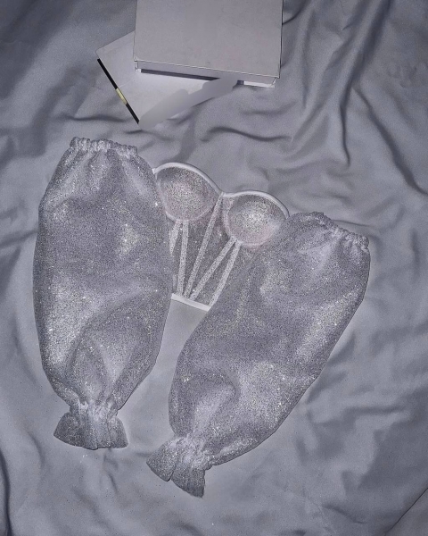 Невероятно сияющий топ – бюстье с имитацией корсета и спущенными пышными рукавами. Держит форму. Спинка идет на змейке.