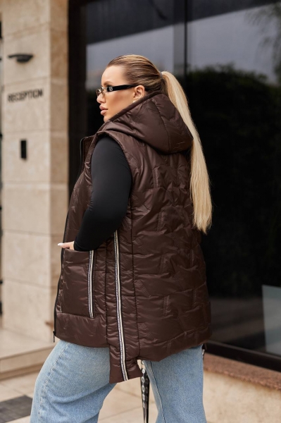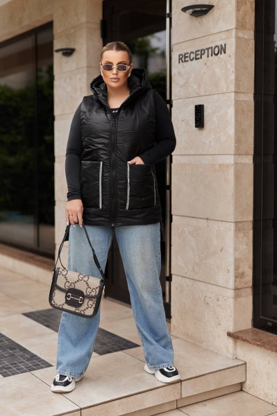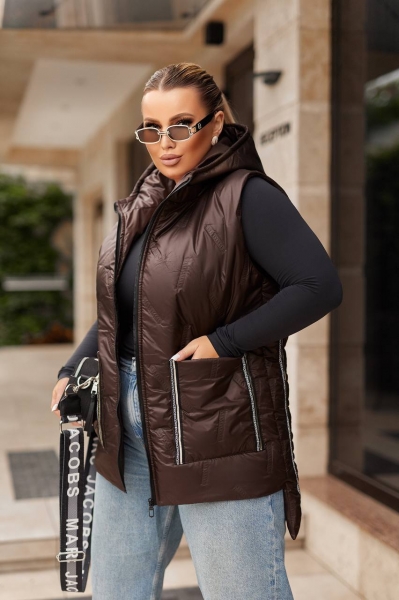 Стильный жилет с капюшоном. Застежка-молния спереди по центру, по бокам – накладные карманы. Жилет по бокам и карману просрочен декорированной тесьмой.